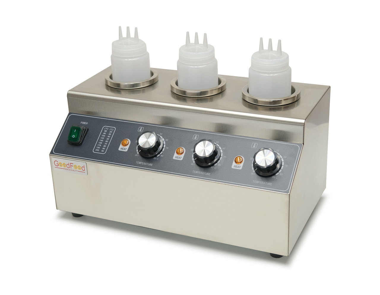 Апарат для підігрівання соусів GoodFood SW3 Призначений для розігрівання соусів, топінгів, гарячого шоколаду, сирного соусу; для професійного використання в ресторанах, столових і точках фаст-фуд. Має міцний корпус і легко миється. Усі основні елементи конструкції виготовлені з неіржавкої сталі. У комплекті три пластикові ємності для соусів. Потужність 240 Вт. Габарити 435×245×350 мм. Вага 7 кг. Паковальні розміри: 490х300х330 мм. Вага в упаковці: 8 кг.